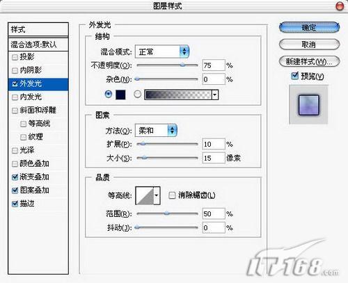 12、双击文字图层打开图层样式面版进行设置。添加外发光样式,扩展10%,大小15像素。如图12所示。