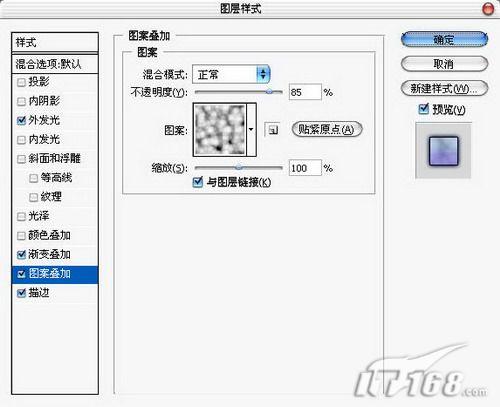 14、添加图案叠加,选择一个合适的图案,将不透明度设置为85%。如图14所示。