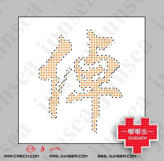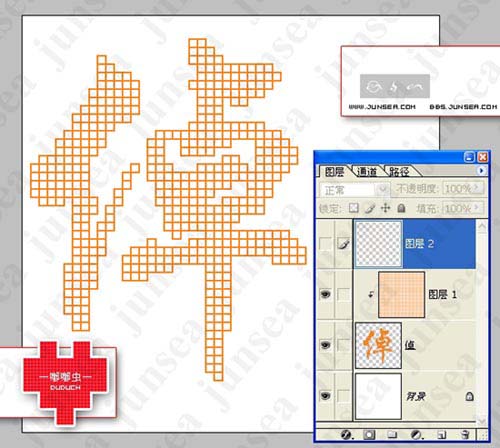 6.返回原来的文件,新建图层,填充刚定义好的图案,并按Alt点击该层和下层的接缝,将两层编组,得到初步块状文字如图5。