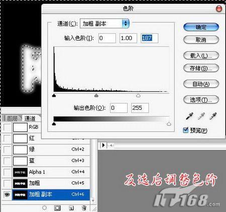 6、选中“加粗 副本”通道进行操作,按下Ctrl+Shift+I反选,然后再按下Ctrl+L打开色阶调整框进行色阶调整,将右侧的白色滑块向左移动一些。如图7所示。