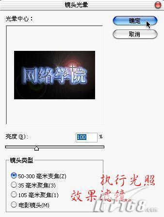 15、最后为了效果更佳漂亮,执行滤镜/渲染/镜头光晕,镜头亮度100%,镜头类型设置为50-300毫米变焦。如图16所示。
