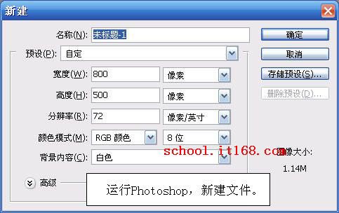 1.首先运行Photoshop,新建一个800x500像素,72dpi的RGB图像。如图1所示。