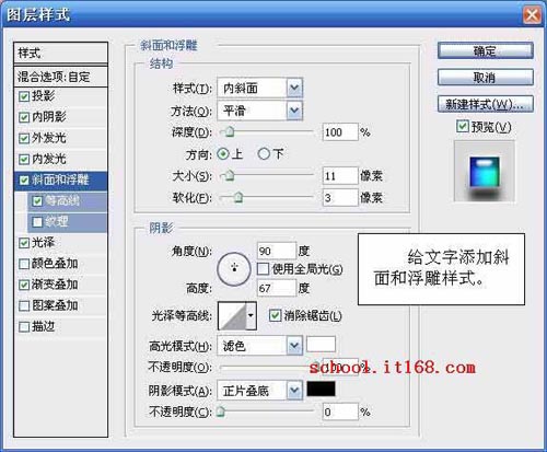 11.给文字添加斜面和浮雕样式,参数设置如图所示。如图11所示。