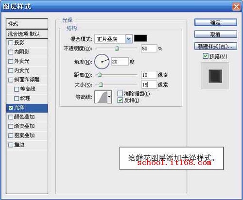 17.给鲜花图层添加光泽样式,参数设置如图所示。如图17所示。