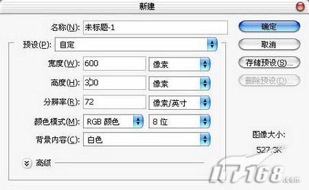 1.首先运行Photoshop,新建一个600x300像素,72dpi的RGB图像。如图1所示。