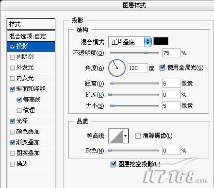 13.双击图层1给它添加图层样式,首先添加投影样式,距离为5像素,扩展0%,大小5像素。如图13所示。