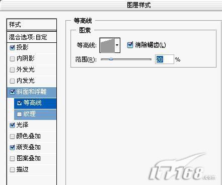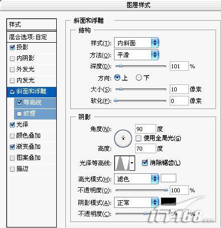 14.添加斜面和浮雕样式,大小10像素,软化0像素,其他设置见图中显示。如图14所示。