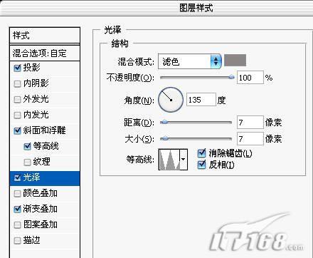 16.添加光泽样式,选取一个合适的灰度颜色,距离7像素,大小7像素,其他设置见图片显示。如图16所示。