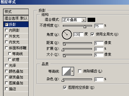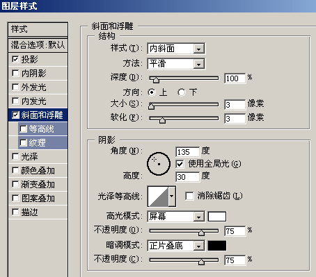 Layer 1 图层,选择 Effects(混合选项) 菜单项目,选择斜面和浮雕)和 投影图层效果。设置参数如图3和图4,效果如图5