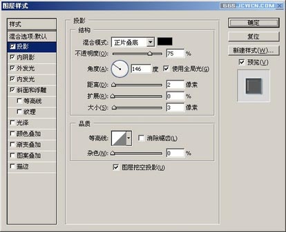 5、选“投影样式”,不透明度75%,距离2,大小3。