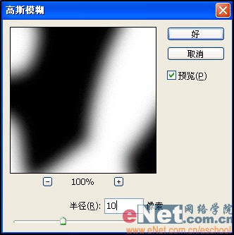 4、执行菜单栏中的“滤镜”“模糊”“高斯模糊”命令,在弹出的对话框中设置参数为10,如图02所示,画面效果如图03所示。