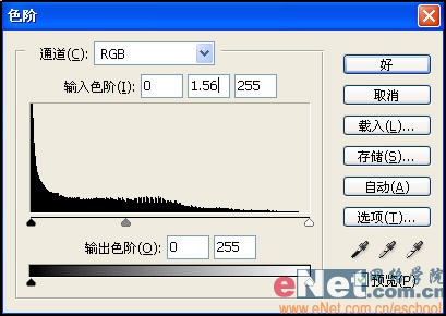 9、将图层1和背景层链接后按Ctrl+E,将其合并,然后按Ctrl+L键,打开色阶对话框,设置如图08所示,图像效果如图09所示。