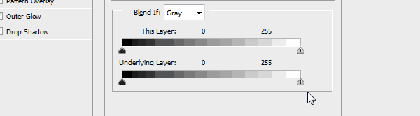 17、双击图层进入图层样式窗口。我们想要将这个蓝色仅仅显示在暗部区域,所以按住ALT键,在颜色混合带中下一图层里,将白色标记往左拖动。
