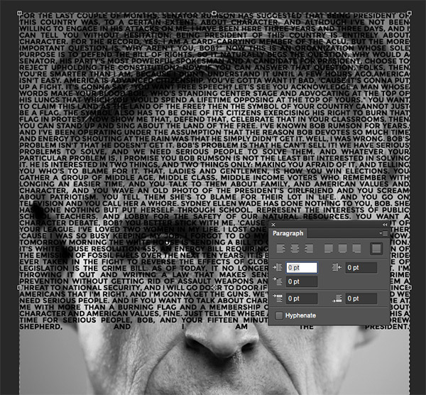 5、选择文字工具,复制个稿子粘贴过来,记得别留空行/空格。把连字选项的勾去掉,选择段落对齐方式,如上图。