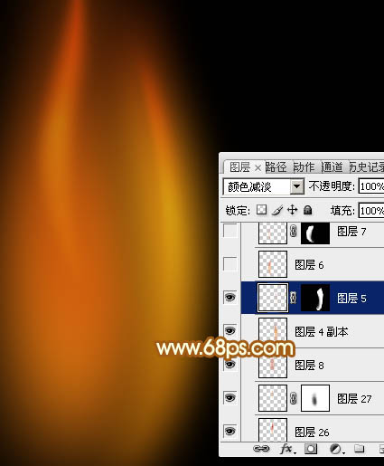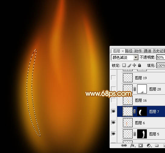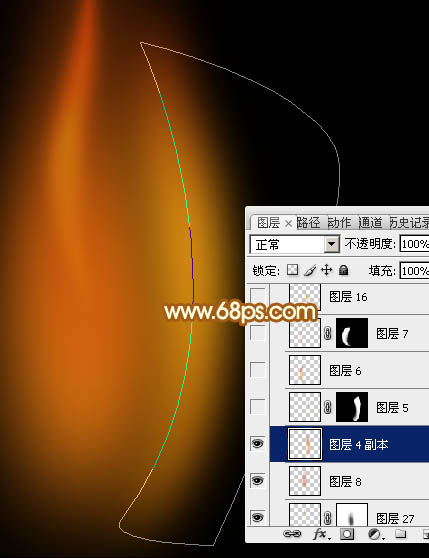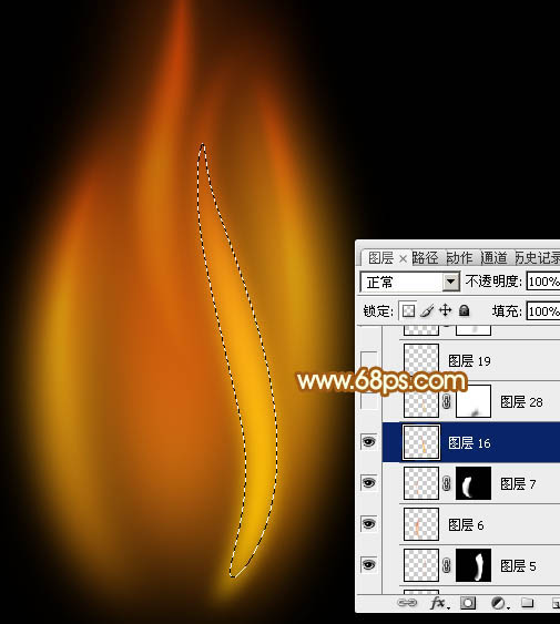 8、新建一个图层,用钢笔勾出左侧边缘的火焰选区,羽化25个像素后填充橙黄色,确定后再用钢笔勾出中间部分的选区如图11,羽化6个像素后按Ctrl