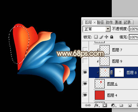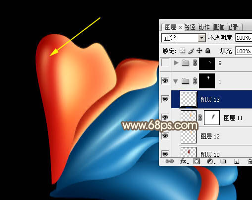 + Alt + G 创建剪贴蒙版,用钢笔勾出下图所示的选区,羽化5个像素后填充稍亮的橙黄色。