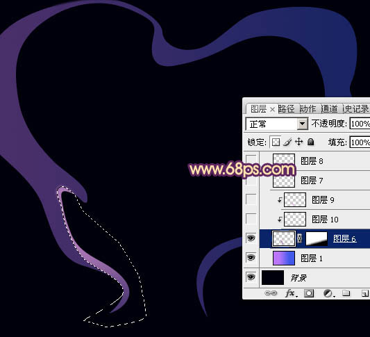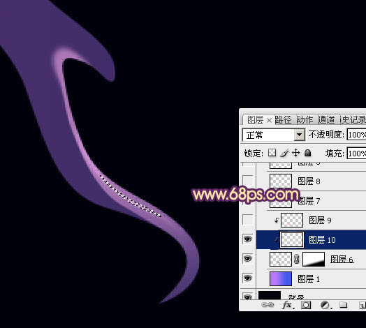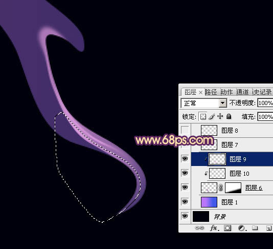 3、新建一个图层,用钢笔勾出下图所示的选区,羽化1个像素后填充紫色。取消选区后添加图层蒙版,用黑色画笔把底部的过渡擦出来,如下图。