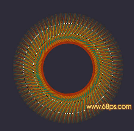 + Alt + G 创建剪贴蒙版,然后把图层填充黑色,用椭圆选框工具拉出下图所示的正圆选区,羽化25个像素后按Delete键删除中间位置,效果如下图。