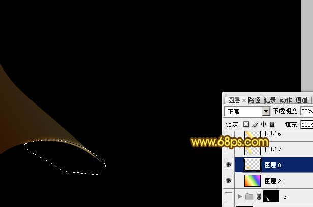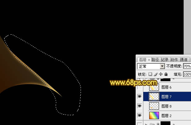 6、回到渐变图层,用钢笔勾出下图所示的选区,羽化8个像素,按Ctrl