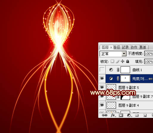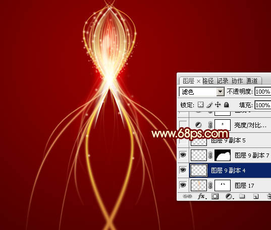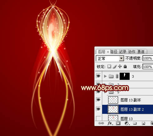 16、在背景图层上面新建一个图层,同上的方法制作一些红色光束,效果如下图。
