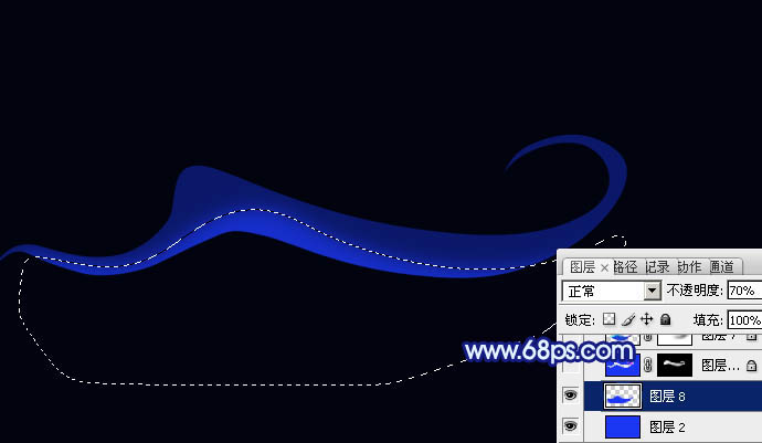 4、新建一个图层,用钢笔勾出光束底部的高光选区,羽化15个像素后填充蓝色:#1B37F3,不透明度改为:75%,效果如下图。