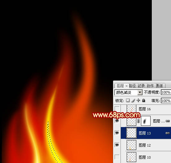 到这一步制作火焰的基本方法基本结束完成。我们只需要制作出火焰的轮廓填充红色,然后再勾出火焰中间部分的高光选区,填充橙黄色,并不混合模式改为“颜色减淡”,即可完成单条火焰,下面就不详述。