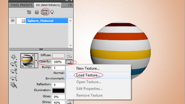 9、回到主场景,现在去的“窗口” > “3D 。选择3D材料。选择不透明度,并载入刚才的PSD文件。