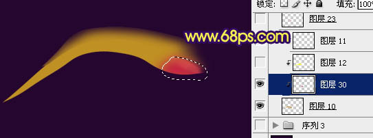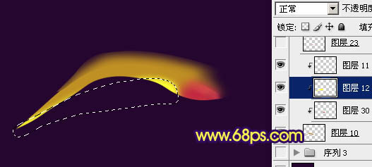 + Alt + G 与前一个图层编组,然后在当前图层下面新建一个图层,用钢笔勾出下图所示的选区,羽化3个像素后填充黄色。