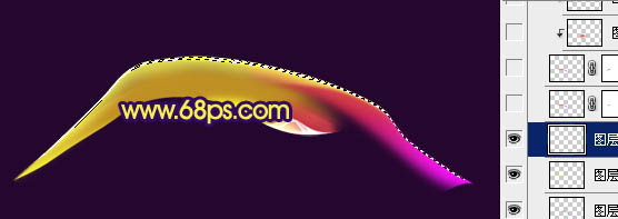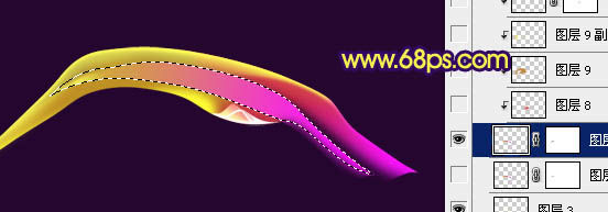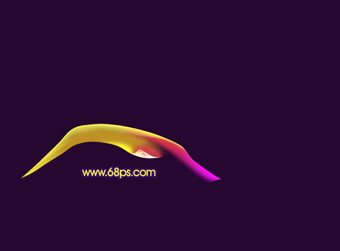 15、新建一个图层,用钢笔勾出下图所示的选区,拉上橙红色至紫色线性渐变。