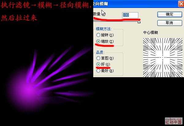 3、执行滤镜→模糊→径向模糊,然后拉到下图位置。