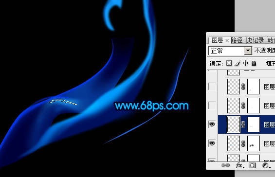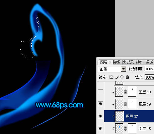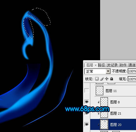 23、在本组图层的最上面新建一个图层,用钢笔勾出图23所示的选区,羽化2个像素后填充颜色:#21ADFF,取消选区后添加图层蒙版,用黑色画笔把过渡部分擦出来,同样的方法制作中间的高光部分,如图24。