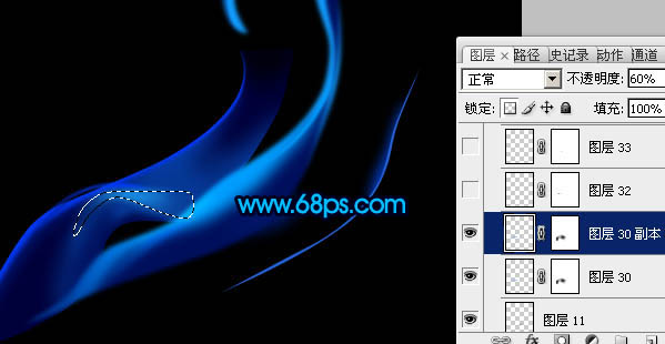 21、新建一个图层,用钢笔勾出下图所示的选区,羽化2个像素后填充深蓝色,效果如下图。
