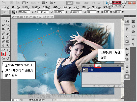 8、设置完成后,关闭“画笔”面板,切换到“路径”面板,并按下<Ctrl+T>组合键,执行“自由变换”命令,调整路径位置。