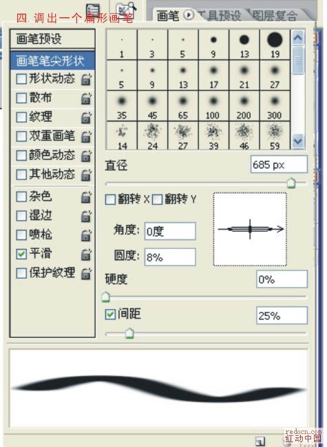 4、调出笔刷设置面板,设置一个扁形的画笔。
