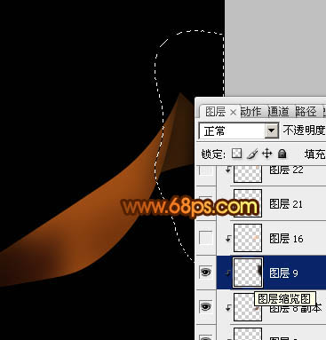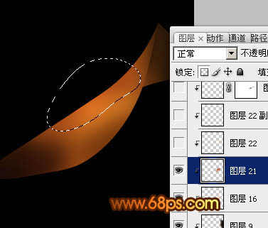 7、新建一个图层,用钢笔工具勾出下图所示的选区,羽化5个像素后填充颜色:#A64817,中间部分可以用减淡工具稍微涂亮一点。