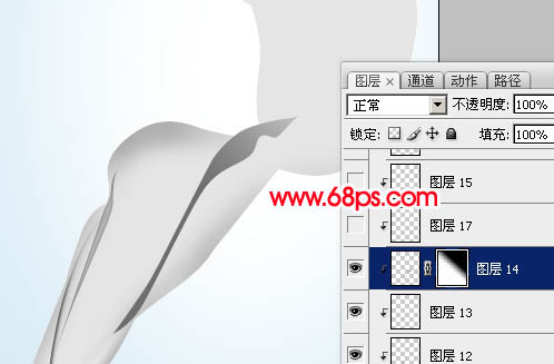 9、新建一个图层,用钢笔勾出图14所示的选区填充黑色,取消选区后加上图层蒙版,用黑色渐变拉出顶部透明效果,如图15。