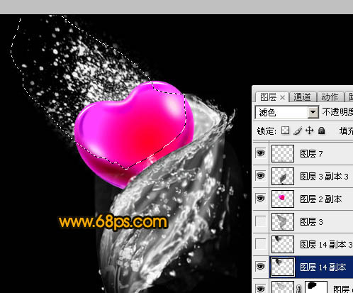 12、打开图26所示的素材,用套索截取部分水花,粘贴到“彩带1”图层上面,图层混合模式改为“滤色”,适当调整角度和大小,效果如图27,如果觉得水花亮度不够,可以把当前图层复制一层,适当调整一下不透明度。