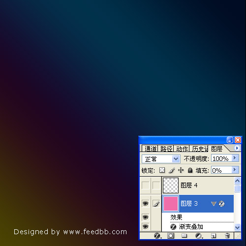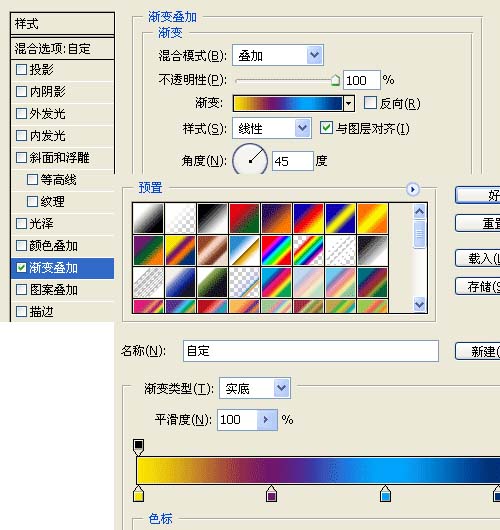 5、新建一个图层,填充任意颜色,并设置填充的透明度为0%,然后选择图层的混合选项>>线性填充,混合模式设为“叠加”,角度设为“45度”,样式选择“线性”,你可以任意定义你喜欢的渐变颜色,如下图所示: