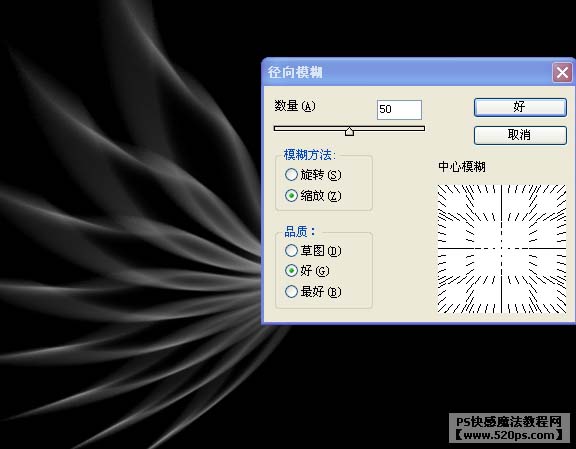 7、将合并的图层复制一层,选择模糊--径向模糊,半径为50像素,如图。