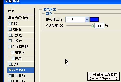 9、选中径向模糊后的图层,设置图层混合选项中的颜色叠加(设为蓝色),如图设置。