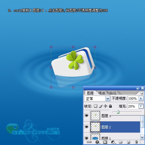 + J把选区部分复制到新的图层,点击图层2将图层不透明度改为:20%,完成最终效果。
