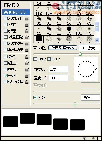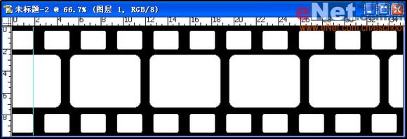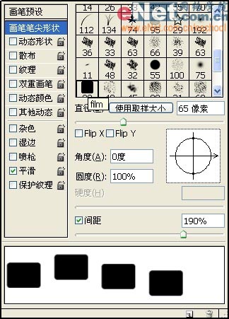 7、接下来就到了制作的关键地方,按X转换前景色,按B选择画笔工具,点击F5调出画笔设置,选择“画笔笔尖形状”,找出我们刚定义的画笔 “film”,设置适当直径及间距,按住Shift键在图层1左上方向右拖动,转换到下方绘制时要先松开SHIFT键,否则会连续绘制。(图层1上可以事先点击CTRL+R显示标尺,并拉出参考线。)