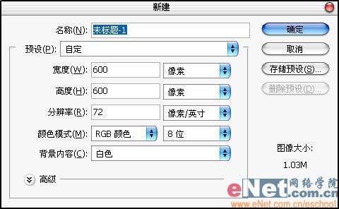 1.首先启动Photoshop,新建一个600x600像素的RGB图像。如图1所示。