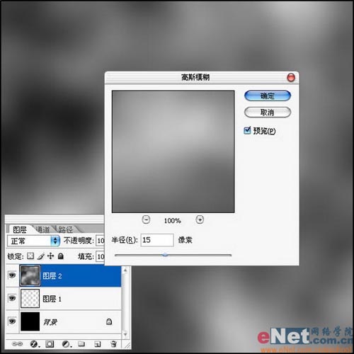5.选中图层2进行操作,执行滤镜/模糊/高斯模糊,模糊半径设置为15像素。如图5所示。