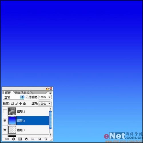 7.将图层2隐藏,然后新建图层3,位于图层2与图层1之间,使用渐变工具从深蓝到浅蓝拉出一条渐变,如图7所示。