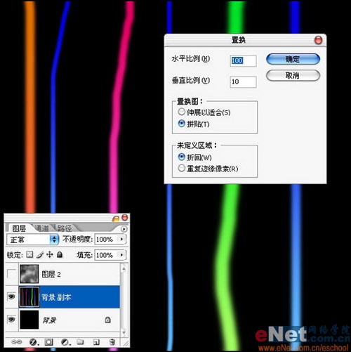 14.选中背景副本图层进行操作,执行滤镜/扭曲/置换,将水平比例设置为100,垂直比例设置为10,选中“拼贴”和“折回”。如图14所示。
