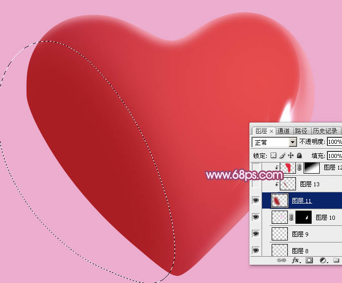 16、新建一个图层,用钢笔勾出右侧暗部选区,羽化80个像素后填充暗红色。