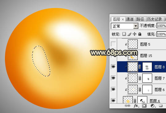 10、新建一个图层,用钢笔勾出下图所示的选区,羽化8个像素后填充淡黄色,同上的方法创建剪切蒙版。