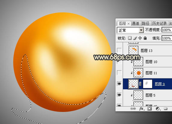 13、新建一个图层,用钢笔工具勾出下图所示的选区,羽化10个像素后填充橙红色,然后按Ctrl