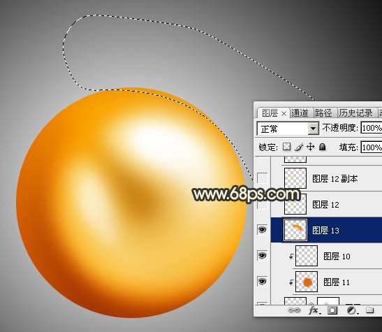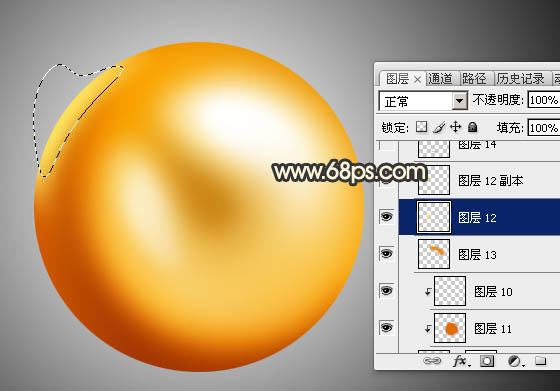 15、新建一个图层,用钢笔勾出左上部的高光选区,羽化6个像素后填充橙黄色